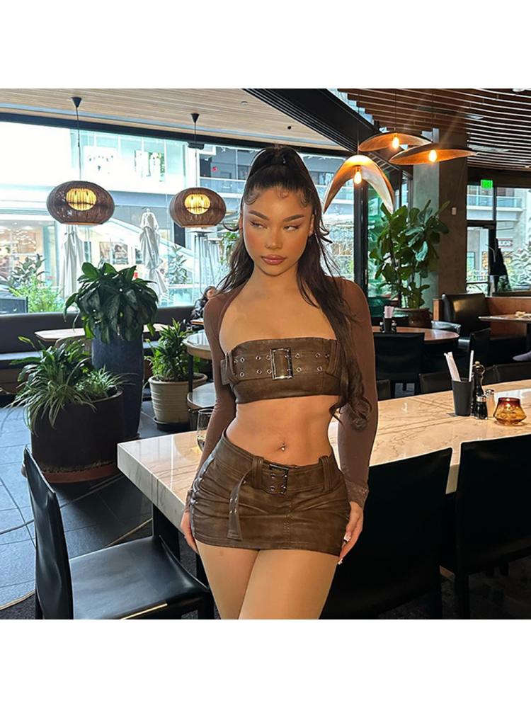 Brown Leather Skirt Set